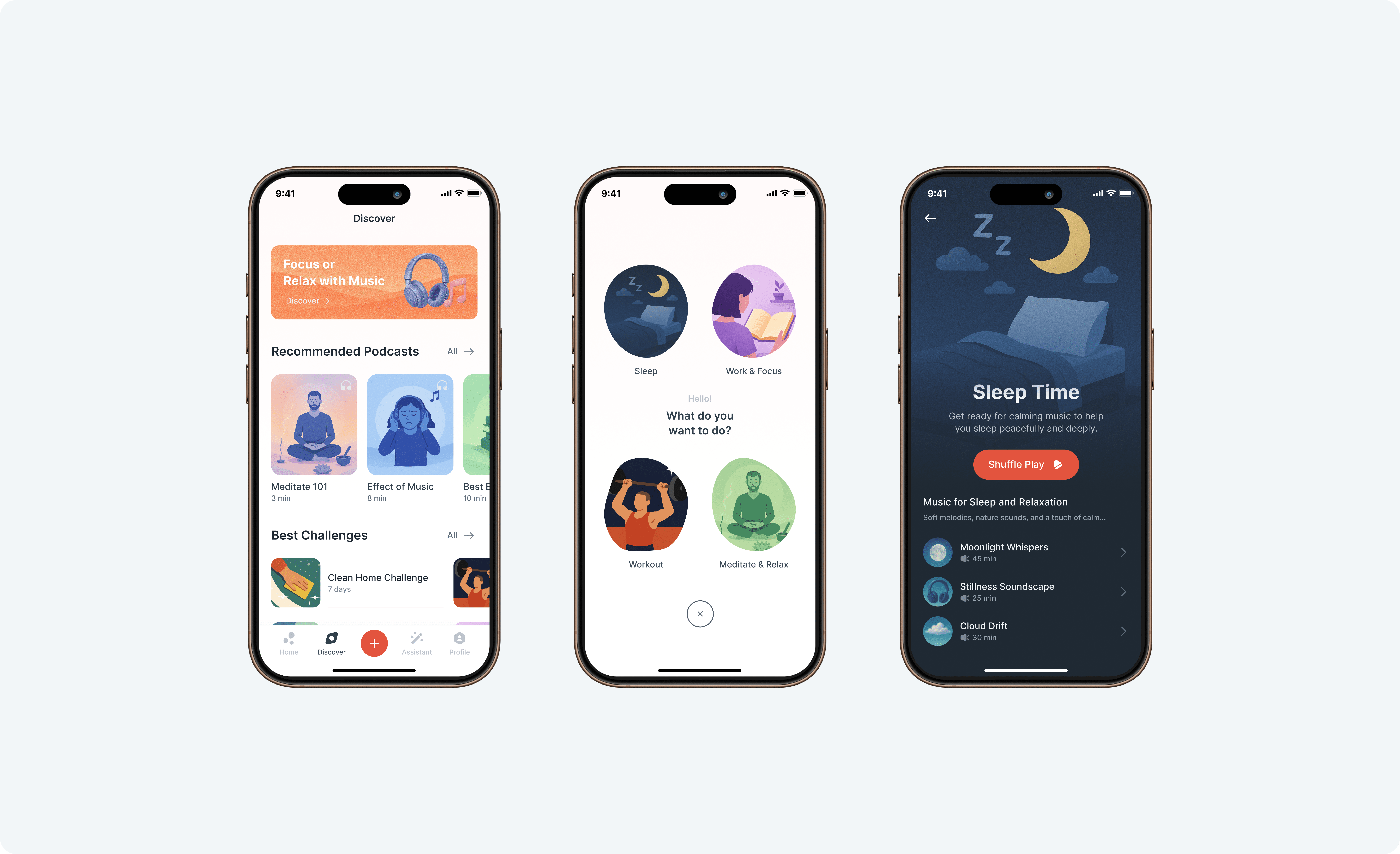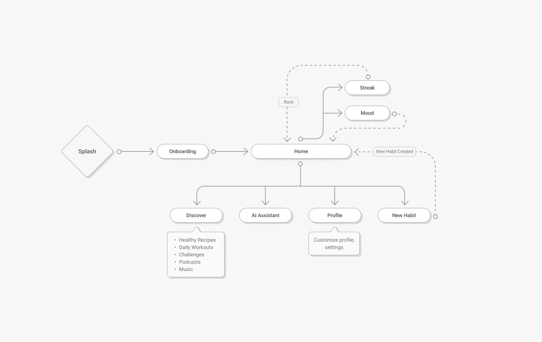 User journeys were defined, wireframes were created, and the process moved into UI design. Each screen was crafted to deliver a simple, motivating experience without overwhelming the user.